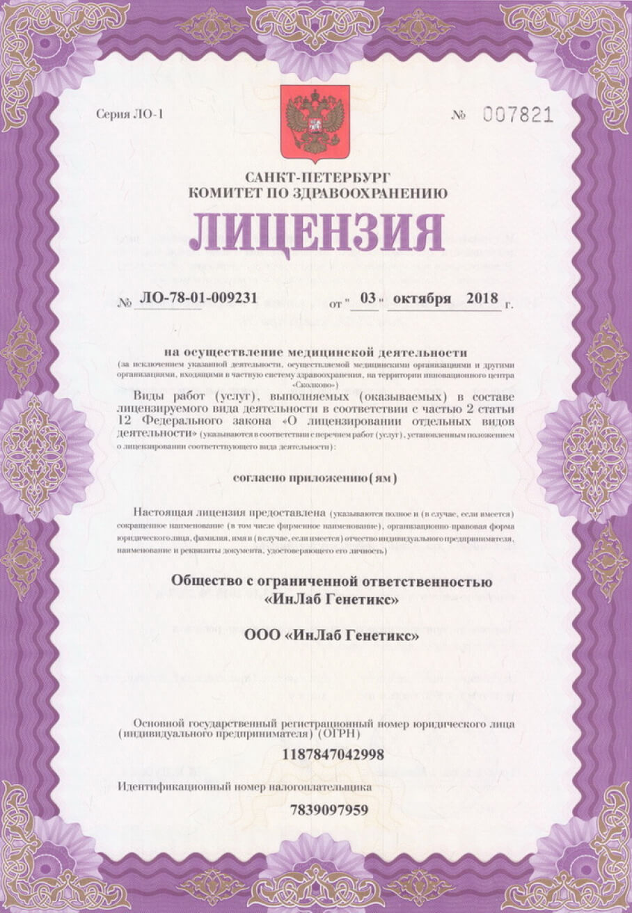 ЛИЦЕНЗИЯ НА МЕДИЦИНСКУЮ ДЕЯТЕЛЬНОСТЬ ЛО-78-01-009231 от “03” октября 2018 г.